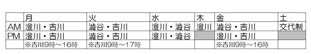| 午前 | ○ | ○ | ○ | ○ | ○ | ○ | × |
